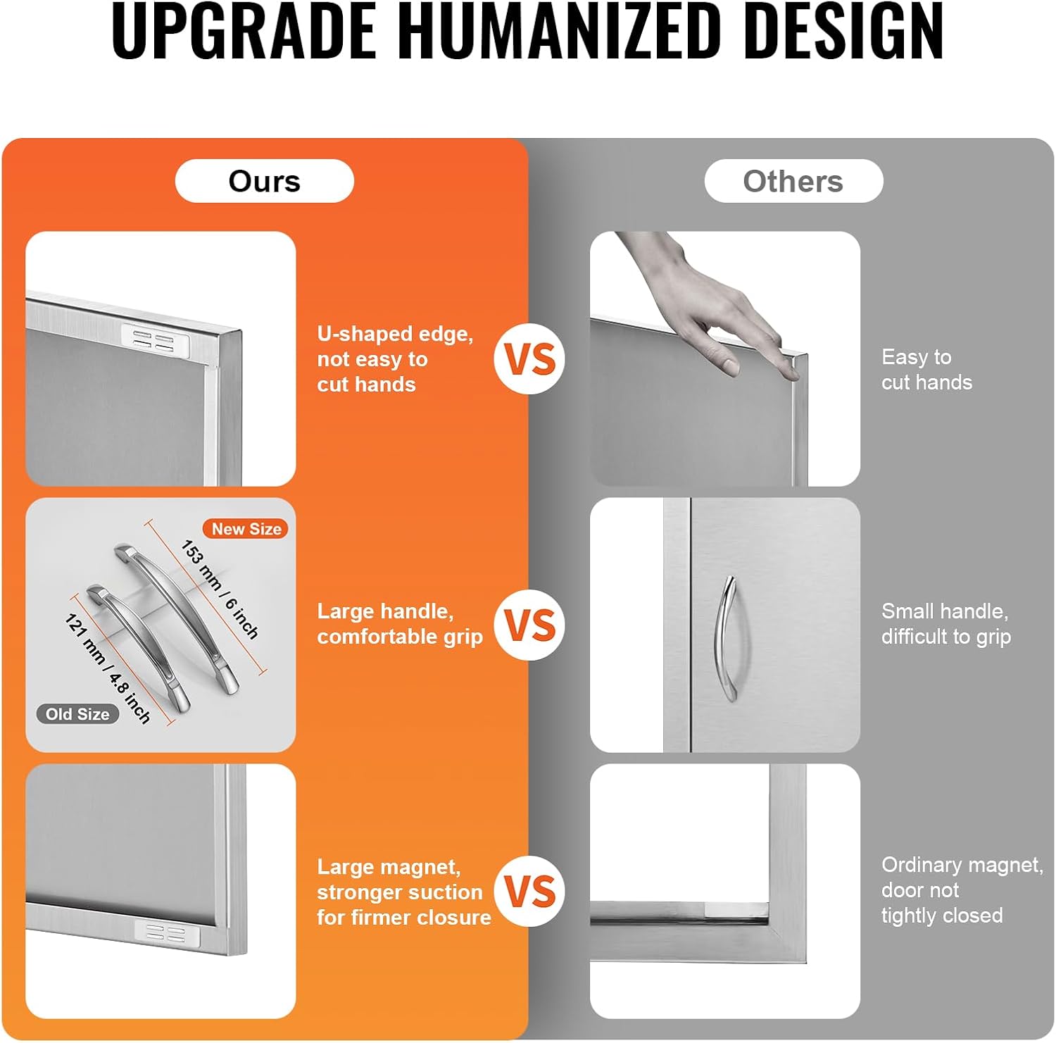 This BBQ access door is made of sturdy high-quality stainless steel structure, rust-proof, waterproof, scratch-resistant, easy to clean without leaving any traces or stains. Fully seamless design, no sharp corners, ensuring user safety.